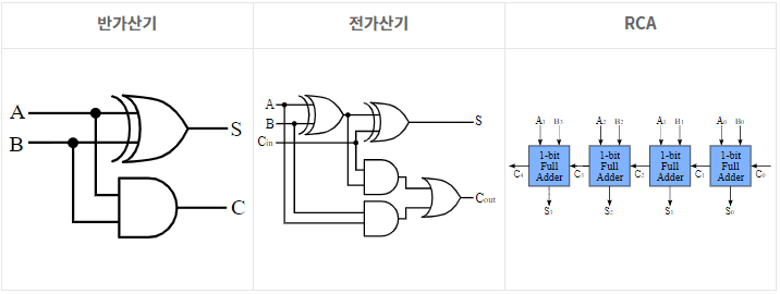 정리하면 반가산기는 입력으로 두 개의 bits가 주어졌을 경우 sum과 carry bit을 구한다. 전가산기는 반가산기에 carry bit 입력까지 더하였고, RCA는 이러한 전가산기를 여러 bits에서 연산 가능하도록 조합한 형태이다.