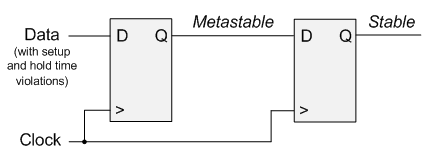 In the figure to the above, a signal that is asynchronous to the clock is being sampled by the first Flip-Flop. This will create a metastable condition at the output. If you again sample this output, you can now fix your metastable event. The output of the second Flip-Flop will be stable.