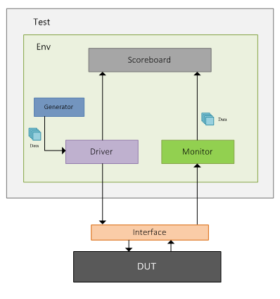 Generator는 유효한 데이터 트랜잭션을 생성하고 드라이버로 전송할 수 있는 검증 컴포넌트이다. Driver는 간단하게 Generator에 의해 생성된 데이터를 Interface로 전송할 수 있다. 데이터 트랜잭션은 Class objects로써 위 그림의 파란색 박스들로 나타내어져있다. Driver가 하는일은 데이터 객체를 받고 DUT가 이해할 수 있도록 변경하는 것이다.